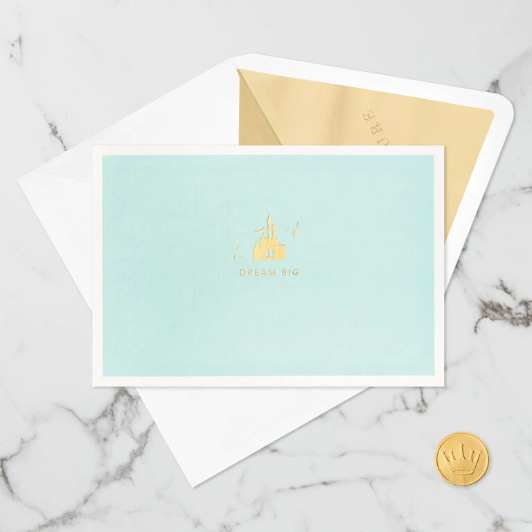 Pop-up greeting card features a castle icon and “Dream Big” message in gold foil on the front. Simply open the card to reveal the 3D pop-up surprise inside—no assembly required: an intricate, laser-cut castle pops out surrounded by Cinderella, Belle, Ariel, Jasmine and puffy white clouds. Glittery swirls and gold foil accents add a pretty touch to the Disney Princess design. This exquisite card crafted from premium card stock is a work of art sure to be displayed all year long, making it an unforgettable way to share a message of love with a special kid or Disney fan on their birthday, graduation or just because. When open, this pop-up card lays flat for display; 3D pop-up inside measures approx. 5.25″ tall.