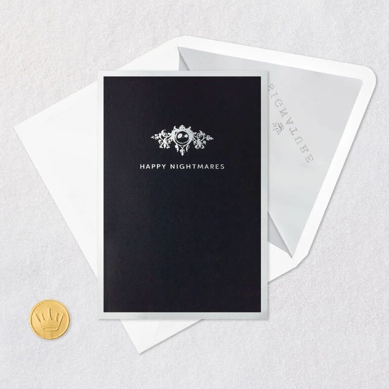 Pop-up greeting card cover features a Pumpkin King flourish design, “Happy Nightmares” message and a shiny silver foil border. Simply open the card to reveal the 3D pop-up surprise inside—no assembly required: an intricate, laser-cut “The Nightmare Before Christmas” scene pops out with Jack Skellington highlighted against a die-cut moon while Zero, Sally, Oogie Boogie and other favorite characters gather around the base. Shimmering silver foil accents adds spooktacular style. This exquisitely detailed card crafted from premium card stock is a work of art sure to be displayed all year long, making it an unforgettable choice for any fan of “The Nightmare Before Christmas” on their birthday, Halloween, Christmas or any other special occasion. When open, this pop-up card lays flat for display; 3D pop-up inside measures approx. 3.5″ H.
