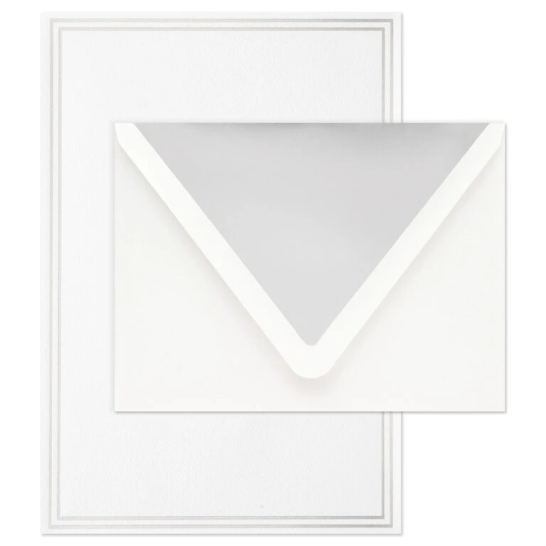 - Boxed stationery set includes 20 sheets/foil-lined envelopes.