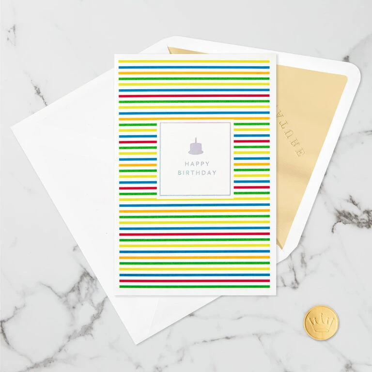 Pop-up birthday greeting card features cheerful stripes with a metallic silver foil birthday cake and “happy birthday” message on the front. Simply open the card to reveal the 3D pop-up surprise inside—no assembly required: intricate layers of colorful laser-cut stars, streamers, confetti and happy birthday wishes accented with sparkly glitter and shimmering silver foil pops out. This fun birthday card crafted from premium card stock is a work of art sure to be displayed all year long, making it an unforgettable way to wish a special kid, friend or family member a very happy birthday. When open, this pop-up card lays flat for display; 3D pop-up inside measures approx. 3.5″ H.