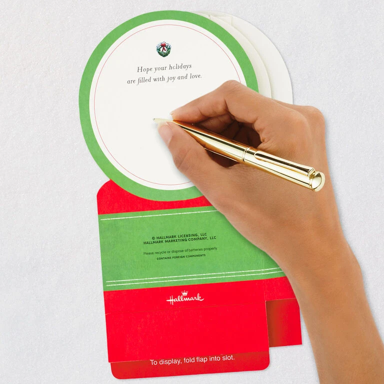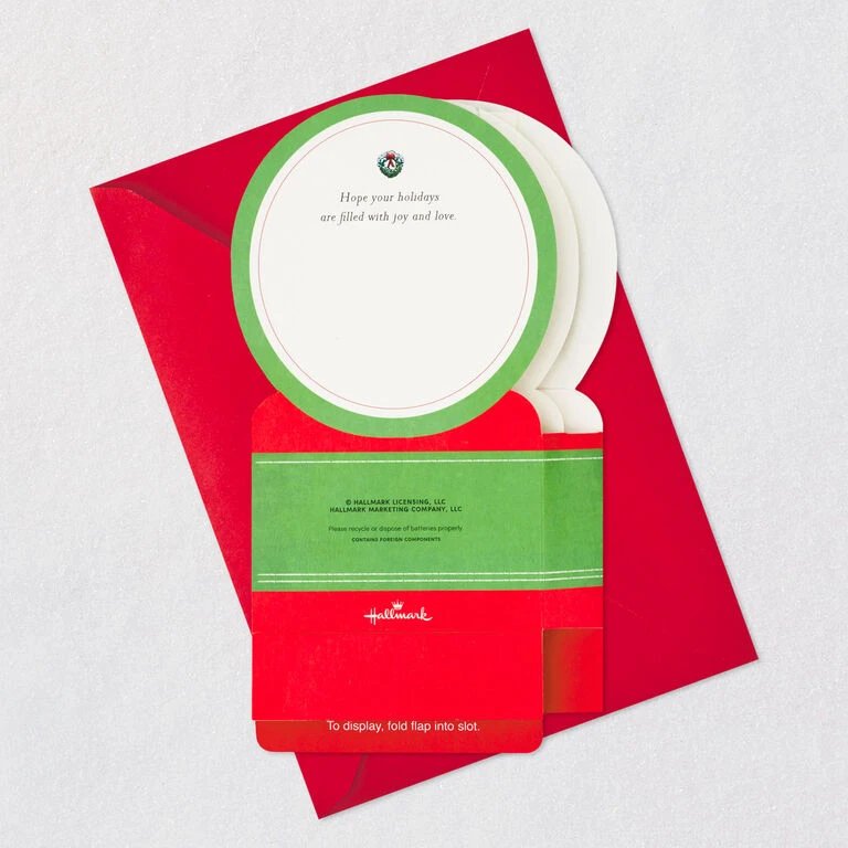 Musical pop-up Christmas greeting card with motion features a laser-cut, three-dimensional snowy scene of an antique red truck and a charming mountain village inside of a 3D snow globe-style design. Musical card plays the song “We Wish You a Merry Christmas” while “snow” blows inside when button on front is pressed. Simply unfold the card to create a fun surprise—no assembly required—that can be displayed all season long. When open for display, 3D pop-up card measures approx. 7″ H.
